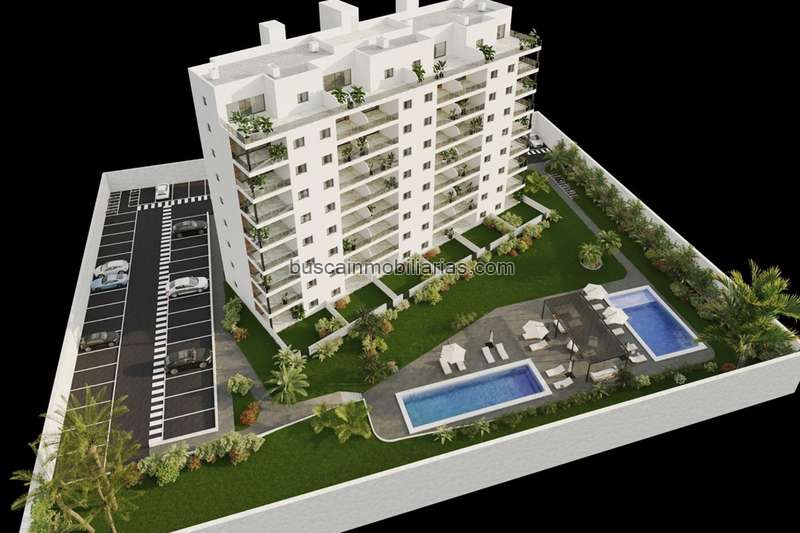 Estructura y fachada: Hormigón armado con forjados unidireccionales en planta baja y reticulares en plantas superiores. Fachadas de ladrillo hueco con cámara de aire y aislamiento térmico, acabado en mortero monocapa o paneles prefabricados.Carpintería exterior e interior: Ventanas de PVC gris con doble acristalamiento, persianas eléctricas en dormitorios. Puerta de entrada de seguridad, puertas interiores lacadas en blanco y armarios modulares.Acabados interiores: Suelos de gres cerámico, paredes en placa de yeso laminado, techos de escayola lisa en estancias principales y falsos techos en cocina y baños. Alicatado cerámico en zonas húmedas.Cocina y baños: Cocina totalmente equipada con electrodomésticos. Baños completos con mobiliario moderno, iluminación tipo spot y acabados cerámicos.Instalaciones: Aire acondicionado por conductos con termostato único. Sistema de aerotermia para agua caliente sanitaria. Ventilación mecánica en baños y cocina. Instalación eléctrica y telecomunicaciones conforme a normativa, videoportero.Zonas comunes: Comunidad cerrada con ascensor, zonas pavimentadas, jardines con riego automático, dos piscinas comunitarias, zonas de descanso, gimnasio exterior, aparcamiento exterior para bicicletas y vehículos. Cada propiedad incluye plaza de garaje privada.