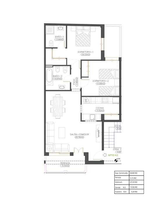 La promoción consta de 13 viviendas bien diseñadas con 2 dormitorios y 2 baños, uno de ellos en suite. Los compradores pueden elegir entre propiedades en la planta baja con patio privado o unidades en la planta superior con terraza. Tenga en cuenta que el edificio no dispone de ascensor, lo que ofrece un estilo de vida más tradicional en un edificio de baja altura. Todas las viviendas incluyen un solárium privado en la azotea, ideal para tomar el sol, relajarse o disfrutar de las vistas panorámicas de los alrededores.