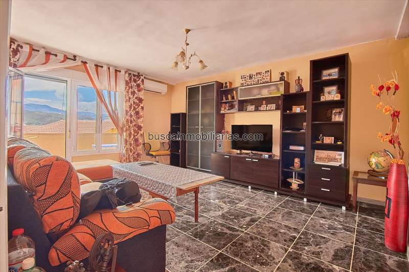 Saliendo del lavadero y la cocina tenemos la SALA que es grande y espaciosa con pisos en travertino, muebles de madera, tv grande, aire acondicionado, sofá grande, parlante de música, 3 mesitas pequeñas de madera, ventanas de PVC con salida a la terraza que es de buen tamaño y tiene vistas despejadas.