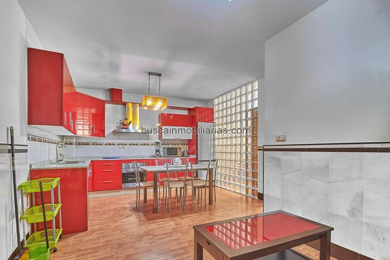 El corazón de la vivienda es su cocina-comedor, equipada con muebles modernos de color rojo que añaden un toque de estilo y elegancia al espacio, ideal para disfrutar de las comidas y el día a día.