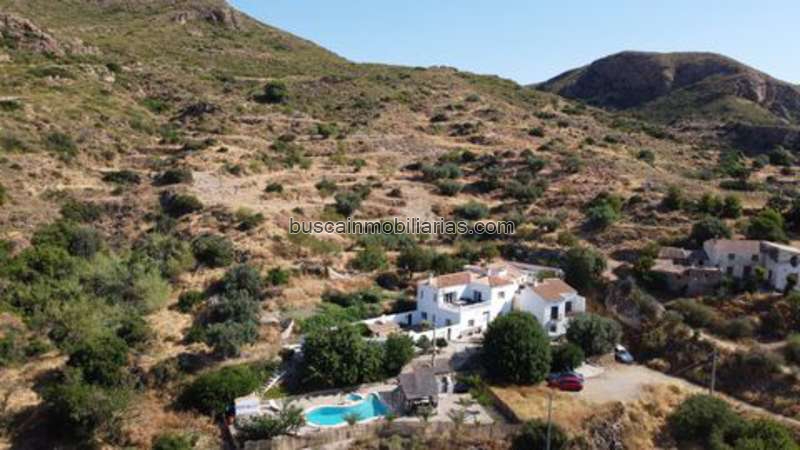 Esta encantadora finca en las colinas de Bedar con segunda casa se encuentra a 30 minutos de las playas de Mojácar. La propiedad consta de una casa principal de tres dormitorios y dos baños, una segunda casa de dos dormitorios y dos baños, una piscina de 5x10m y un amplio trastero. La propiedad fue completamente renovada en 2008 y se encuentra en un terreno de 2.410 metros cuadrados en un entorno natural único. La propiedad forma parte de un pequeño grupo de casas en la pedanía de Bédar: El Albarico. El Albarico se encuentra en un espacio natural protegido, a 15 minutos del pueblo de Bedar y a 30 minutos en coche de las playas de Mojácar y Vera. La Casa Principal Un camino de unos 150m te lleva al área de parking frente a ambas casas. Unos escalones te lleva a la puerta de entrada de la casa principal. La vivienda tiene una superficie construida de 184,4 metros cuadrados. En la planta baja se encuentra el dormitorio principal con un amplio baño privado y vestidor. También en la planta baja hay dos amplios dormitorios dobles con armarios empotrados y un baño completo. Las escaleras te llevan a la sala de estar en la primera planta. Aquí tiene una sala diáfana con terraza de 30 m² desde donde hay una hermosa vista sobre el paisaje montañoso. Conectada a la sala de estar, hay una cocina espaciosa y totalmente equipada. La Segunda Casa El diseño de la segunda casa es similar a la casa principal. Tiene una superficie construida de 98 metros cuadrados. Consta de dos dormitorios y dos baños en la planta baja. La escalera pasa por un aseo antes de llegar al salon. En la misma planta, hay una cocina equipada con acceso a una terraza con vistas abiertas al impresionante paisaje. Exteriores Ligeramente separada de las casas esta la zona de piscina. Hay una piscina de 5x10m con amplia zona de terraza. Hay terrazas para tomar el sol, una terraza cubierta con un bar y barbacoa. Al fondo hay una pequeña casita con las instalaciones de la piscina. La casa principal cuenta con un patio con jardín privado y una casita para almacenamiento. Alrededor de las casas y el área de la piscina hay varios zonas de ajardinadas y árboles maduros, así como un huerto y frutales. Agua, Gas y Luz Ambas propiedades comparten una instalación eléctrica trifásica. La compañía de agua mantiene las instalaciones de agua que suministra el área de El Albarico y la Fuente de Albarico. Todavía tienen que instalar los contadores, por lo que hasta hoy, no se han emitido recibos y el ayuntamiento de Bedar está coordinando el proyecto de instalación de contadores. Además del agua de res, la propiedad tiene un octavo parte del agua de un pozo. Esto abasteció a la propiedad el agua de la casa durante muchos años, antes de la instalación de agua de red. El agua todavía está disponible y en uso regular. El gas es proporcionado por botellas de 35 kg. La instalación cuenta con certificado de seguridad vigente y consta de un suministro de seis botellas (3 en modo suministro y 3 en reserva, según se requiera). Hay un contrato de seis botellas en vigor.