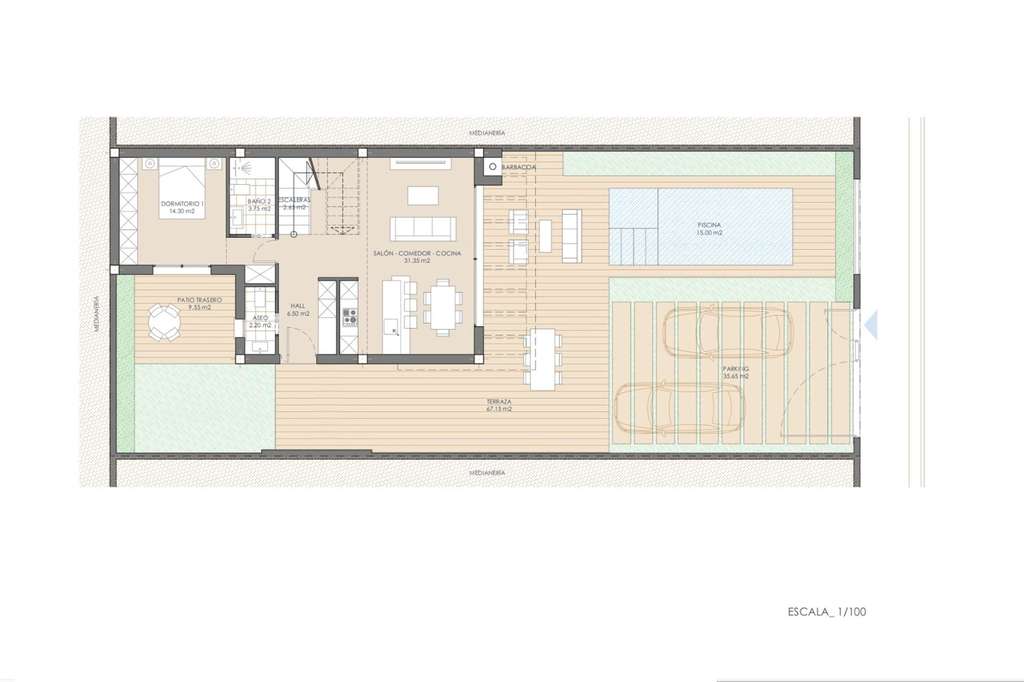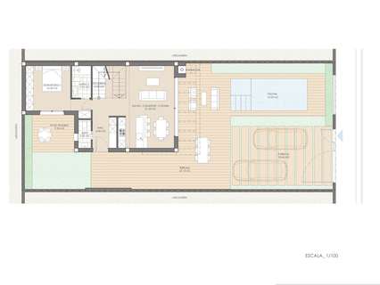 La cimentación y estructura de las viviendas están resueltas con hormigón armado y bajo garantía decenal. Fachadas diseñadas para reducir la demanda energética de la vivienda, combinadas con diversos materiales para conseguir una estética coherente en cuanto a composición y color como se refleja en la infografía.Amplias terrazas dotadas de sólidos antepechos para proporcionar seguridad en las barandillas de las terrazas, otorgando amplitud y luminosidad. Los cerramientos exteriores de la parcela se tratarán con los mismos materiales utilizados en la vivienda, garantizando la integración en el conjunto residencial.Cubiertas planas ventiladas y aisladas sobre forjados, con diferentes acabados según su ubicación y uso. La puerta de entrada a la vivienda será blindada. Las puertas del dormitorio principal, baños secundarios y aseos incluirán cerraduras. La carpintería exterior constará de ventanas y balconeras de Aluminio lacado con persianas enrollables de lamas de aluminio, motorizadas en salones. Sistema de video portero, que garantiza el control de acceso individual para cada una de las viviendas. Los cuartos de baño estarán equipados con lavabo, inodoro y ducha, y los aseos dispondrán de inodoro y lavabo. Los baños cuentan con sanitarios de diseño moderno, de porcelana vitrificada acabada en blanco, de la marca Roca y modelo Gap, con grifería monomando cromada o negro mate a elegir. Las mamparas de ducha irán fijadas con cristal templado de 8mm con una longitud de 80cm. Cada preinstalación está diseñada para un sistema de hasta 10 paneles, que pueden instalarse con un inversor solar conectado a la red eléctrica de la vivienda para minimizar el consumo eléctrico. Estos paneles se integrarán en el tejado, en la zona de instalación, ocultos desde el exterior de la vivienda.La entrada de aire a las viviendas se asegurará mediante la incorporación de un sistema de microventilación en las ventanas de salones y dormitorios. Salida de humos independiente para campana extractora de cocina.Preinstalación de domótica en la vivienda con preparación para una futura instalación de domótica para control de climatización y calefacción de habitaciones, persianas y posibles sistemas de alarma de intrusión. Preinstalación de videovigilancia en la zona de aparcamiento y zonas interiores de la parcela.Cada vivienda dispondrá de una cocina totalmente instalada y acabada en color blanco mate, según diseño, con sistema GOLA. Los armarios interiores serán blancos, con puertas abatibles y cajones con freno bajo placa vitrocerámica, listos para instalar electrodomésticos vistos. Los electrodomésticos no están incluidos. Los dormitorios con armarios empotrados se entregarán con puertas correderas en color blanco mate.Estas viviendas se caracterizarán por su eficiencia y ahorro energéticos, así como por su baja contaminación. Están diseñadas con un enfoque de mayor eficiencia para un menor consumo energético, promoviendo un uso racional de la energía a la vez que se cuida el medio ambiente, la calidad y el confort climático dentro de la vivienda. Los vidrios de baja emisividad evitan la pérdida de calor hacia el exterior, lo que se traduce en un ahorro económico al retener el calor en la vivienda durante el invierno y evitar la entrada de calor durante el verano. Los sistemas de climatización y agua caliente sanitaria están diseñados con sistemas individuales para maximizar el consumo y la e...