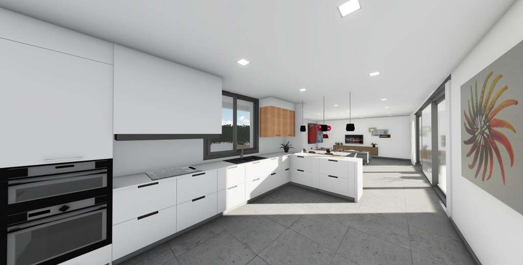 Cocina amueblada con encimera y frente de Silestone, electrodomésticos (lavadora, horno, vitrocerámica, campana extractora, lavavajillas, frigorífico y aerotermo).