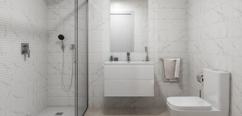 Baños con acabados modernos, incluyendo calefactores para toallas, platos de ducha con mamparas de cristal y muebles empotrados