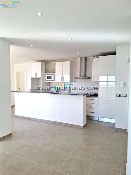 La vivienda se distribuye en un gran salón dividido en dos zonas, una puede dedicarse al salón y la otra puede utilizarse a modo de comedor. Cada una de ellas con acceso a una terraza distinta independiente lo que dota a la estancia de luminosidad y amplitud. La cocina, se encuentra abierta, unida al salón y perfectamente amueblada. Dispone de una barra americana a conjunto con la encimera muy útil a la hora de cocinar.