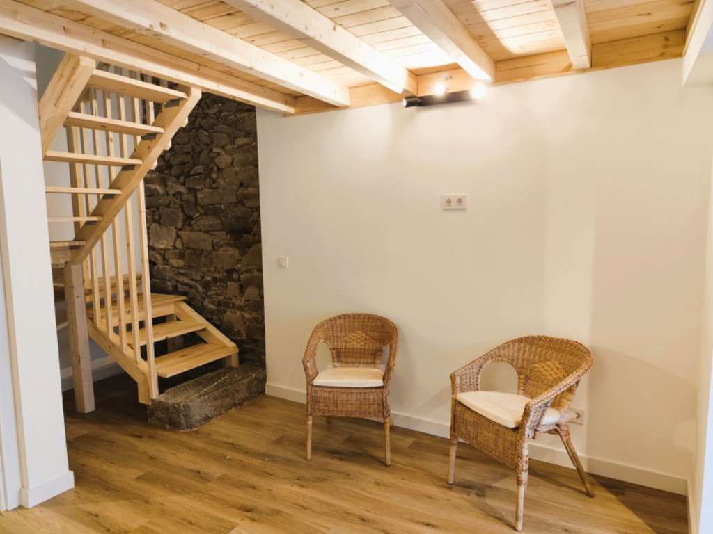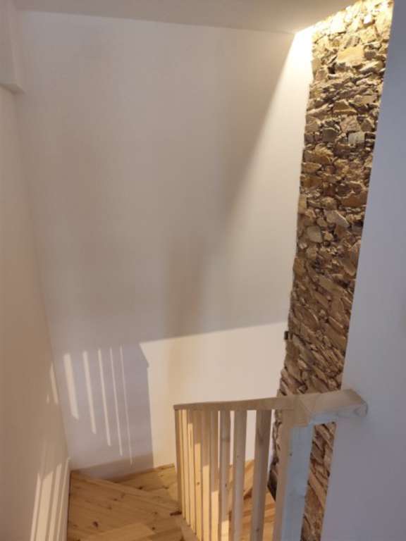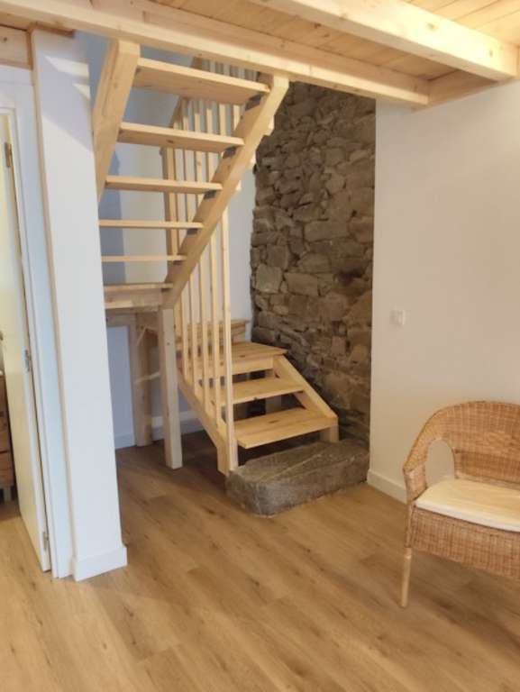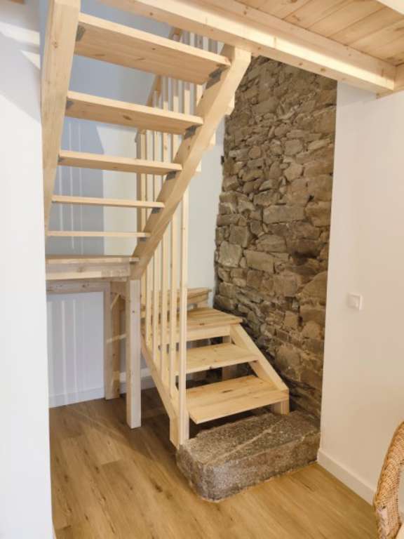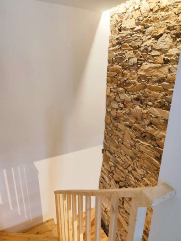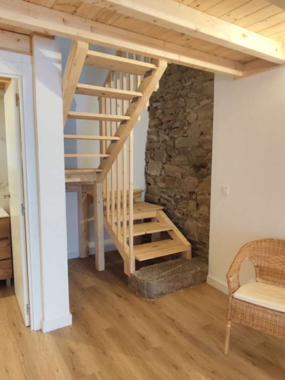 En la planta superior, al subir la escalera, encontramos una zona de piedra vista aportando ese valor antiguo, que aporta personalidad y calidez, y dos habitaciones.