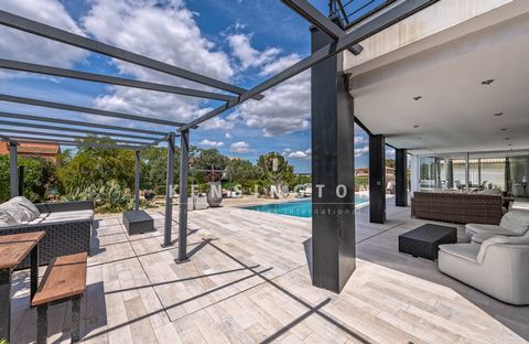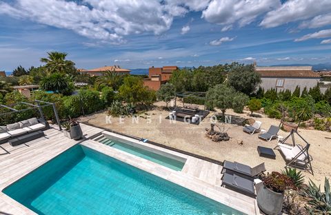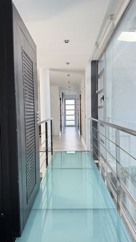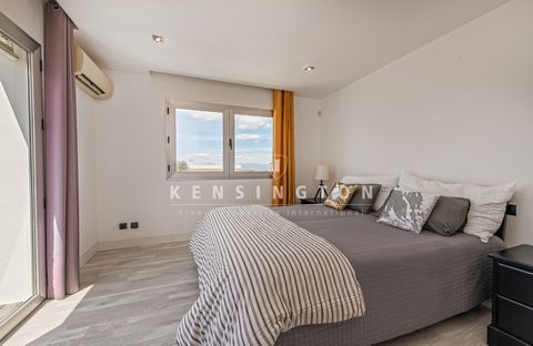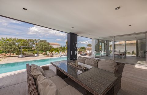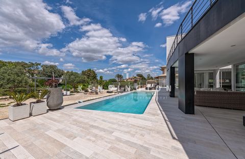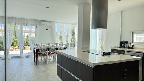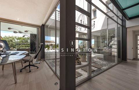 Das lichtdurchflutete Wohn-/Esszimmer schafft durch ein Atrium, große Schiebefenster und einen Kamin eine einladende Atmosphäre. Angrenzend befinden sich ein separates Gästezimmer sowie ein Gästebad. Die moderne Küche mit Essbereich öffnet sich ebenfalls zur Terrasse. Insgesamt verfügt die Villa über fünf Schlafzimmer und vier Bäder.