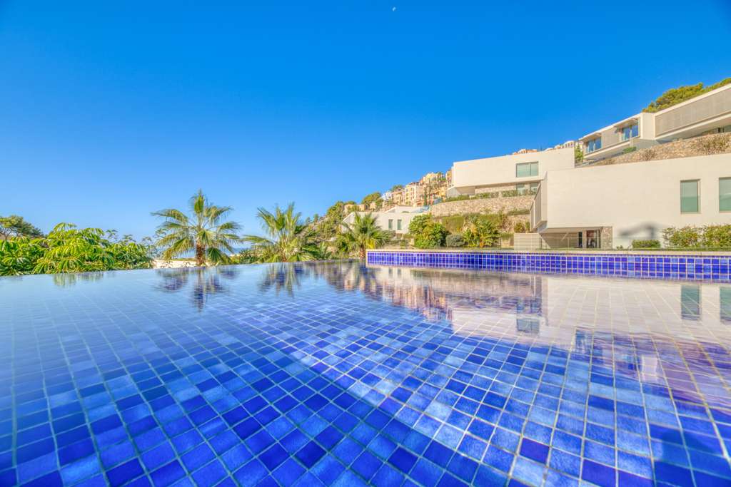 La moderna villa ofrece aprox. 280 m² de superficie habitable (aprox. 493 m² de superficie construida) en la primera planta, con un amplio salón-comedor con cocina abierta, aseo de invitados y patio (5 m²). Desde esta planta se accede a la zona exterior con terraza cubierta (41 m²), piscina privada (20 m²), zona de estar (15 m²), otra terraza descubierta y vistas al mar y a la montaña. En la segunda planta se encuentran tres dormitorios, cada uno con baño en suite y vestidor. Los tres dormitorios ofrecen fantásticas vistas a las montañas y al mar. Una característica especial de esta casa es otro amplio espacio diáfano en la segunda planta con lavadero y aseo de invitados, que podría convertirse en un cuarto dormitorio con baño en suite. En el sótano hay una sala técnica, otras habitaciones de uso gratuito y acceso directo al garaje subterráneo, donde hay una plaza de aparcamiento privada. Hay otra plaza de aparcamiento descubierta frente a la entrada de la casa. La zona comunitaria ofrece hermosos jardines, una gran área de piscina con vistas al mar y sala de fitness, así como una casa club con servicio de conserjería, piscina cubierta climatizada, jacuzzi, sauna seca, sauna de vapor, otra sala de fitness, oficinas para uso privado y una zona de bar con una hermosa terraza al aire libre.