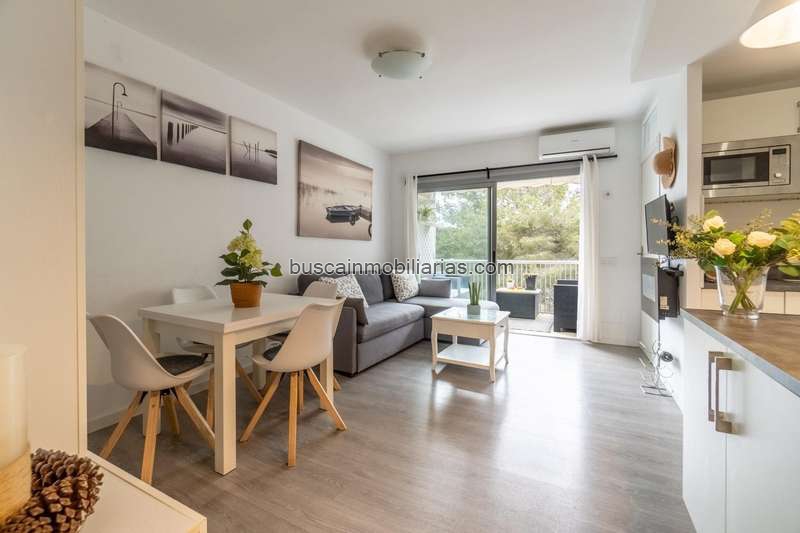 La vivienda presenta un espacio principal moderno y acogedor, con un salón-comedor muy luminoso y una cocina abierta totalmente equipada. Desde esta estancia se accede a una agradable terraza privada con vistas parciales al mar y al entorno natural.