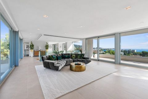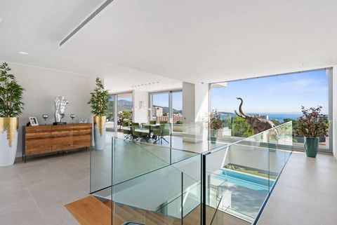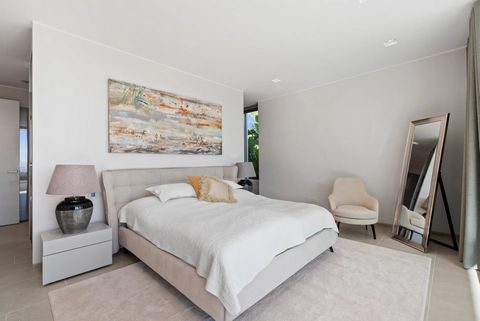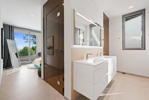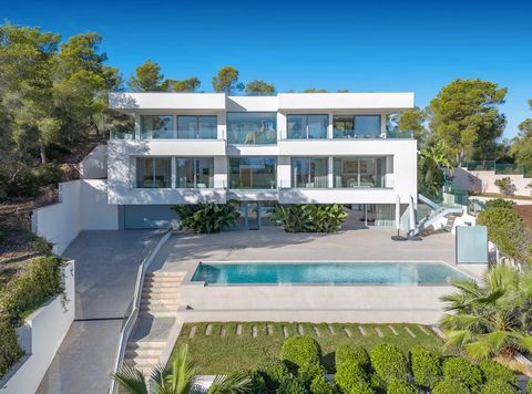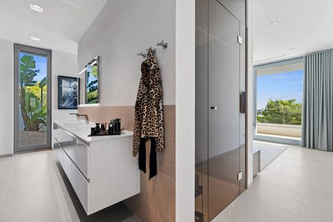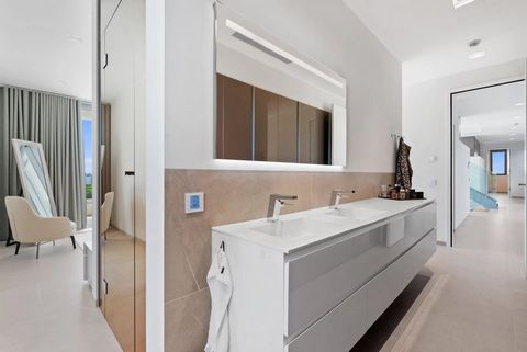 In an elevated position and surrounded by tranquility, this minimalist style luxury villa stands as a haven of design and comfort in an exclusive cul-de-sac next to a green area. Its southeast orientation allows you to enjoy sunlight throughout the day and partial sea views that provide an unparalleled Mediterranean atmosphere.