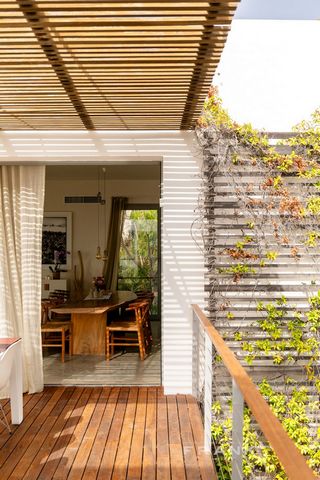 Unos escalones más arriba, la terraza comedor se proyecta desde la cocina y el salón, cubierta por una pérgola de madera y delimitada con barandillas de acero inoxidable. Las vistas dominan la escena.