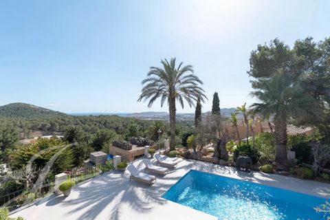 The spacious living-dining room provides access to a large terrace with swimming pool, as well as stunning views of the mountains and Ibiza. The open-plan but discreetly located kitchen adds a modern and functional touch to the space.