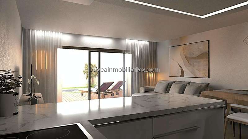 -Planta baja: la entrada de la vivienda se realiza mediante un porche que da al recibidor donde se encuentran los accesos al garaje y al aseo, a continuación entramos al estar-comedor-cocina con terraza y jardín (piscina opcional) en la parte trasera; también con la escalera que conecta con la planta primera.