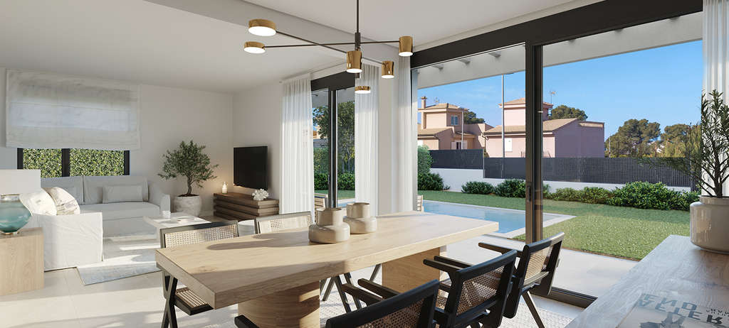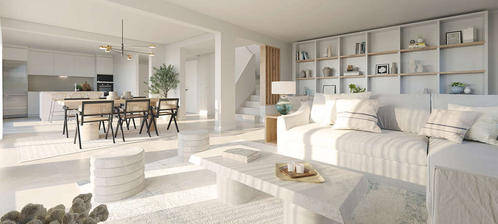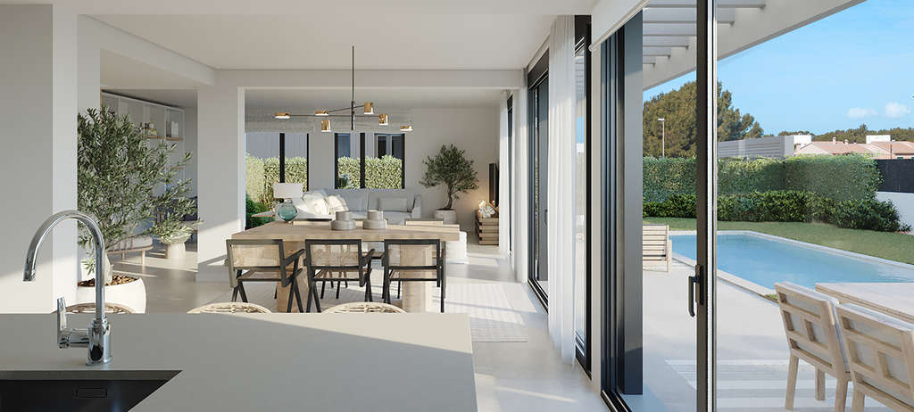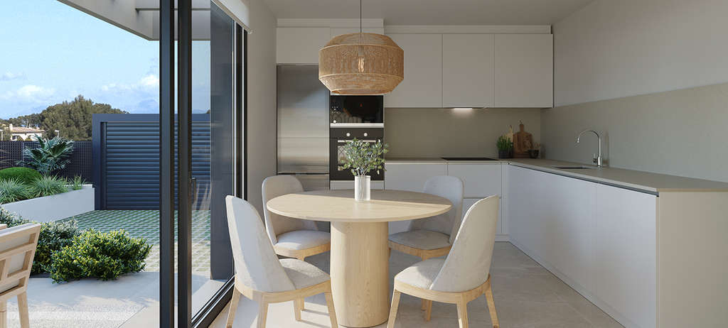 Todas estas viviendas cuentan con un amplio salón comedor abierto (con una superficie de hasta 30m2) y una preciosa cocina totalmente equipada. Además, estas viviendas cuentan con un amplio jardín privado de más de 200 m2, cada uno con piscina privada para que puedas disfrutar del clima mediterráneo.