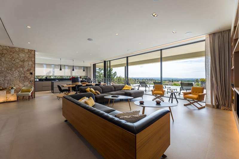 Dispone de 5 dormitorios dobles, despacho, 6 baños, un amplio salón con chimenea integrado a una cocina abierta, y varias zonas de estar. Destacan sus calidades de lujo: suelo radiante con control individual, aire acondicionado por aerotermia, carpintería interior de roble y grandes ventanales con vistas despejadas a Palma y la bahía.