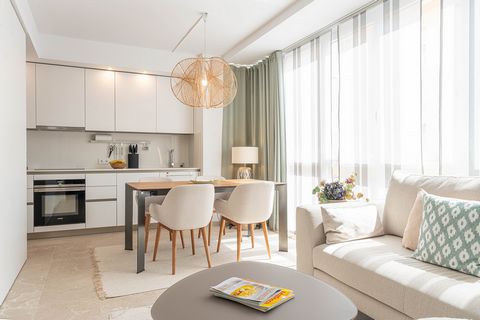 El piso cuenta con una superficie habitable de 64 m² y ofrece dos amplios dormitorios, dos baños, uno de ellos en suite, además de una cocina abierta y un salón. Con su diseño elegante y moderno, y gracias a los grandes ventanales, la vivienda se llena de una bonita luz natural y ofrece un ambiente luminoso y acogedor.