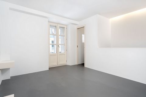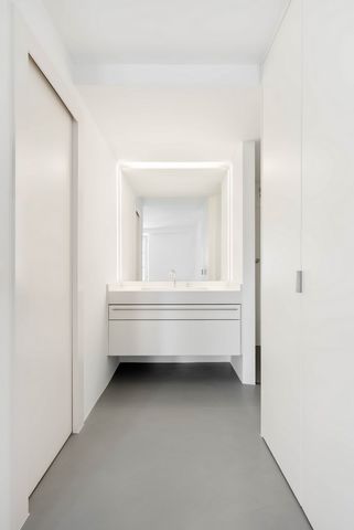 El piso ha sido reformado recientemente y presenta un diseño minimalista y transparente, con suelos de microcemento y conductos prismáticos a lo largo de las paredes que aportan luz natural a toda la vivienda.