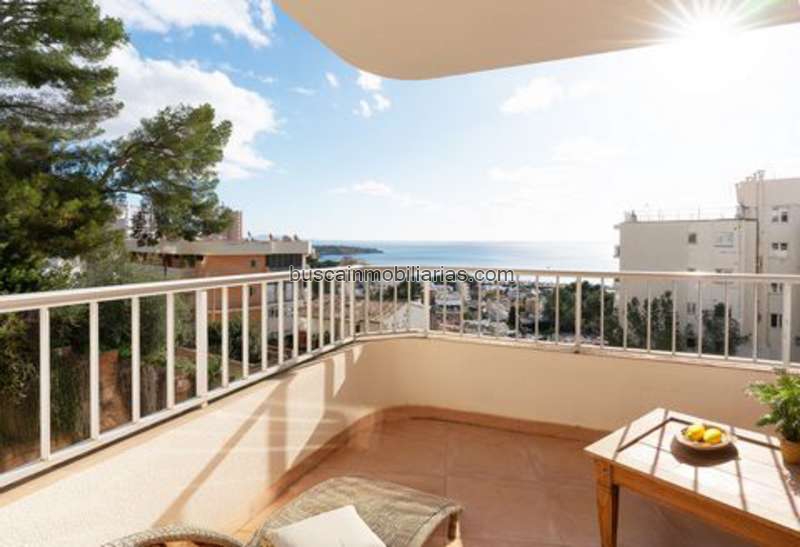 Amplio piso en San Agustin con terrazas y vistas al mar Inmueble para renovar con dos dormitorios, terraza y piscina Este es un piso con vistas al mar en la popular zona de San Agustín. El piso está situado en la 4ª planta de un edificio bien mantenido con ascensor y piscina comunitaria. La playa de arena fina de Cala Major está muy cerca y el puerto de Cala Nova de moda se puede llegar en cinco minutos. A Palma se llega en menos de 10 minutos en coche.