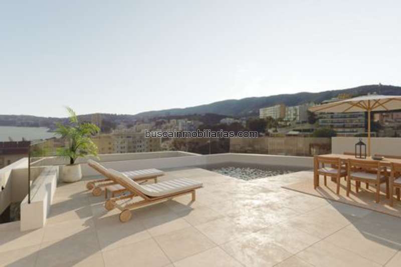 C'an Juliá es un complejo de pisos de nueva construcción, que consta de solo 6 pisos de lujo, lo que lo convierte en ideal para quienes buscan una promoción más privada y exclusiva en la zona. Este ático cuenta con casi 159 m² de terrazas. Hay una terraza en la misma planta que la zona de estar, además de una terraza privada en la azotea con piscina y amplio espacio para un comedor, una cocina de verano y una zona de relax.