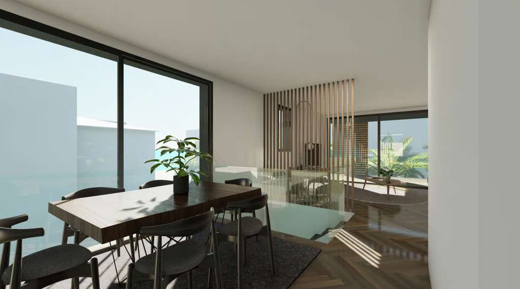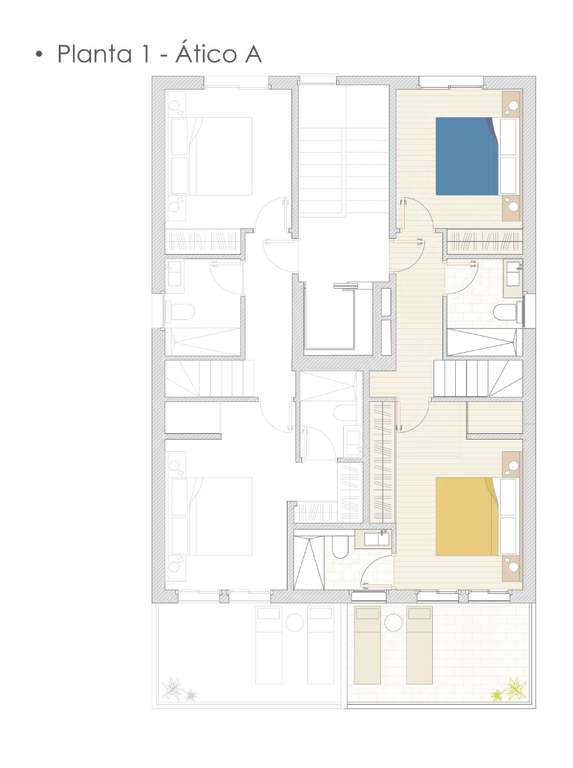 En la primera planta hay dos dormitorios y dos baños . El dormitorio principal tiene baño en suite y acceso a una terraza. En la segunda planta hay un salón (con acceso a una terraza) y un comedor con cocina americana . La cocina también tiene acceso a una terraza , desde la cual una escalera de caracol conduce a la hermosa azotea (solárium) con impresionantes vistas a las aguas turquesas y una piscina privada para máxima comodidad.