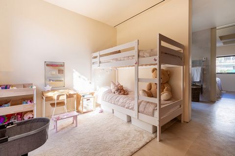 Una escalera negra de estilo industrial te lleva a la planta superior, donde se encuentra la cocina de diseño abierta, integrada con el segundo salón, dos dormitorios –uno de ellos con baño en suite– y una acogedora terraza con vistas bonitas. Los grandes ventanales a lo largo de la terraza permiten una abundante entrada de luz natural, aportando una sensación de amplitud y luminosidad a toda la vivienda.