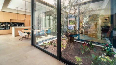 The main living area revolves around a central atrium with internal garden and consists of 4 bedrooms with en suite bathrooms, living room with fireplace, fully fitted kitchen, pantry, wine cellar, home office, guest cloakroom and lavatory, laundry room, private gym and garage parking, including two electric chargers.