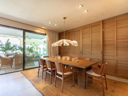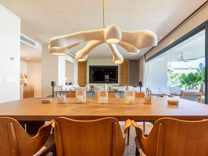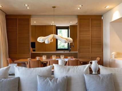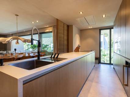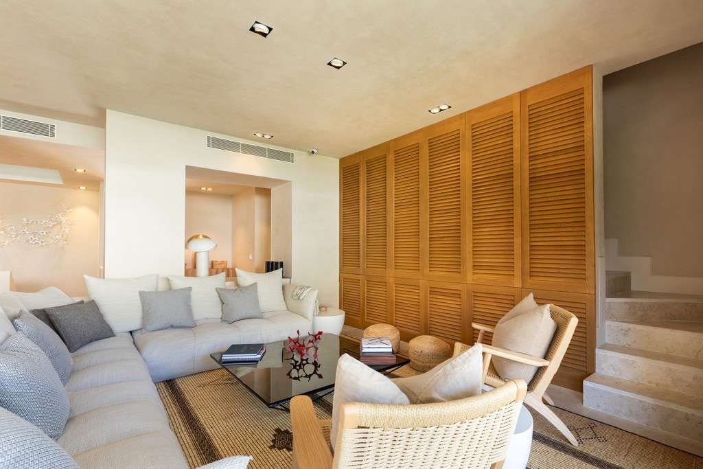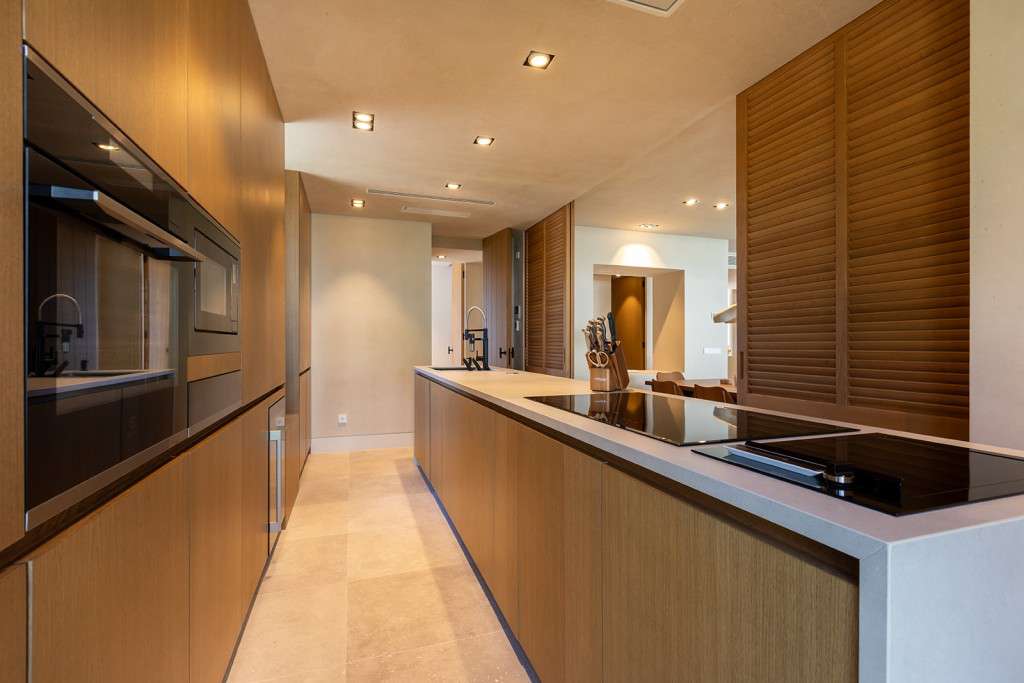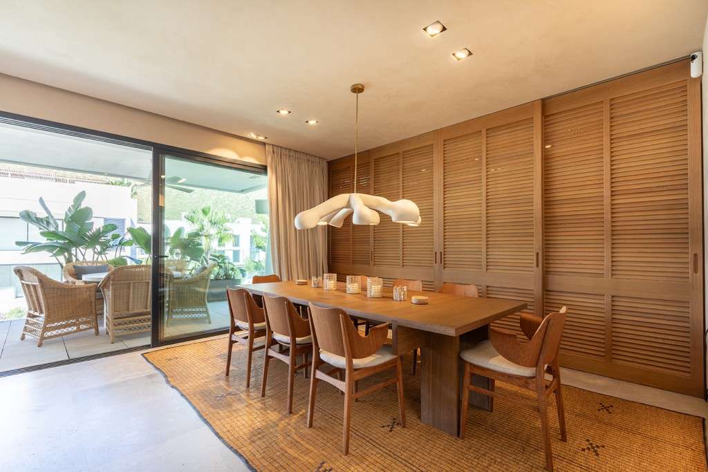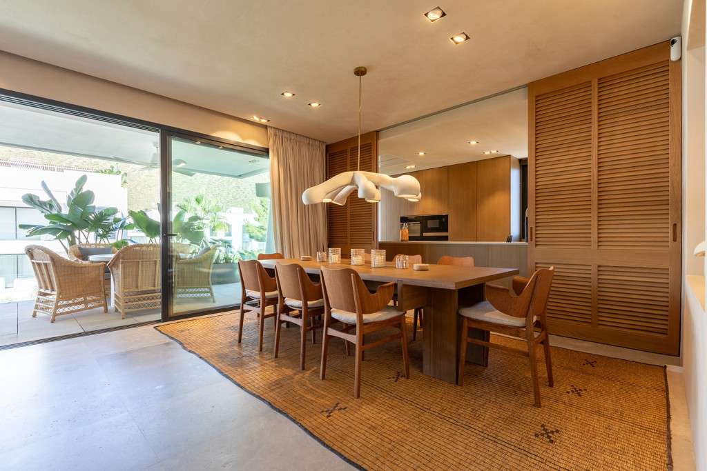 Nada más entrar, nos recibe el amplio salón-comedor, bañado por la luz natural que entra a través de las puertas correderas de cristal del suelo al techo, que se abren a un generoso balcón. Junto al salón se encuentra la lujosa cocina de alta gama totalmente equipada, con electrodomésticos integrados y una impresionante isla central. Este nivel primario cuenta con dos amplios dormitorios dobles, cada uno con baño en suite y armarios empotrados a medida, junto con un aseo de invitados. Una hermosa escalera interior conduce a la planta baja, donde se encuentran otros dos dormitorios dobles con baños en-suite y armarios empotrados, uno de ellos designado como la tranquila suite principal.