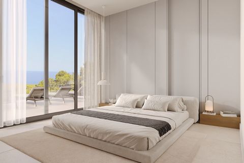 160 m2 featuring an open-plan living/dining area, modern kitchen, guest toilet, a large double bedroom with en-suite, and a second double bedroom with a private bathroom. Includes a 45 m2 infinity pool and sun terrace with sea views.