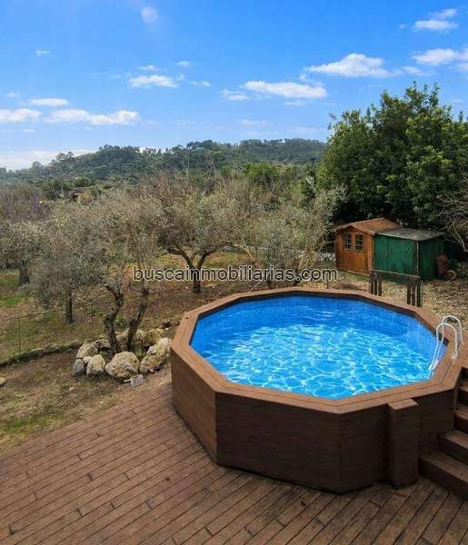 Vistas a la piscina y al terreno con árboles frutales