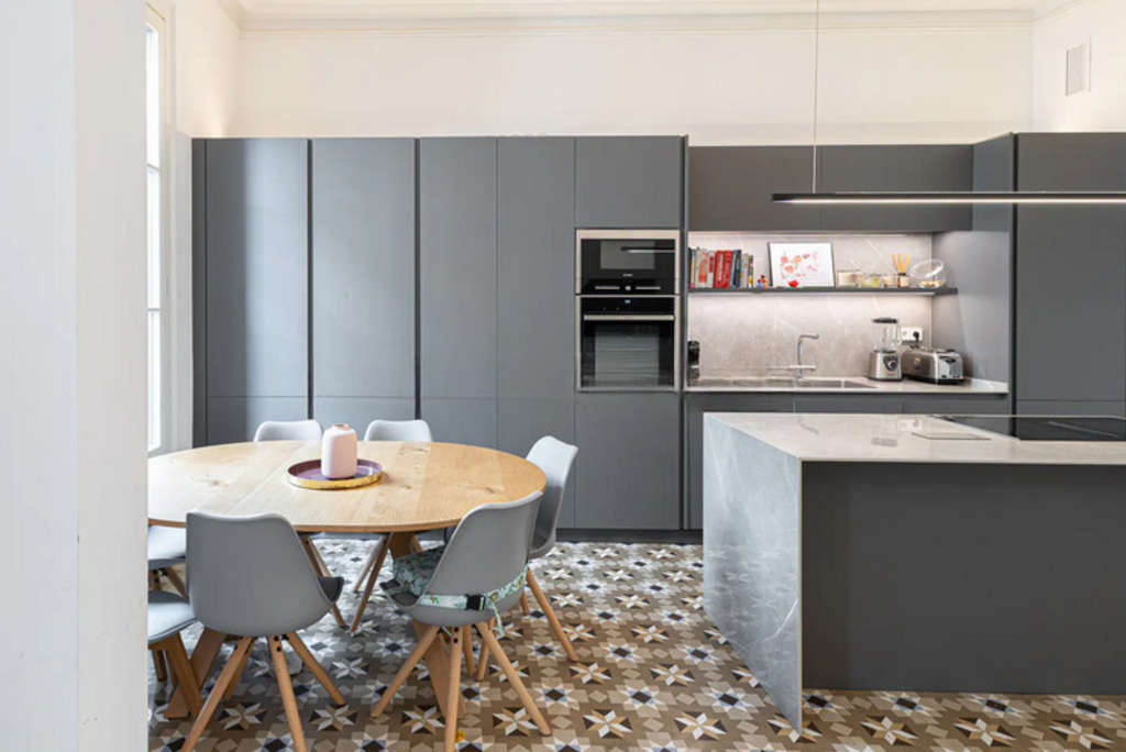 El segundo dormitorio doble, de gran tamaño, dispone de acceso a un balcón que llena el espacio de luz natural, mientras que un tercer dormitorio doble, con una mini zona de despacho, completa la distribución. Un amplio baño independiente con bañera se encuentra cerca de la moderna cocina, totalmente equipada con electrodomésticos de alta gama y una isla central que invita a cocinar con comodidad.