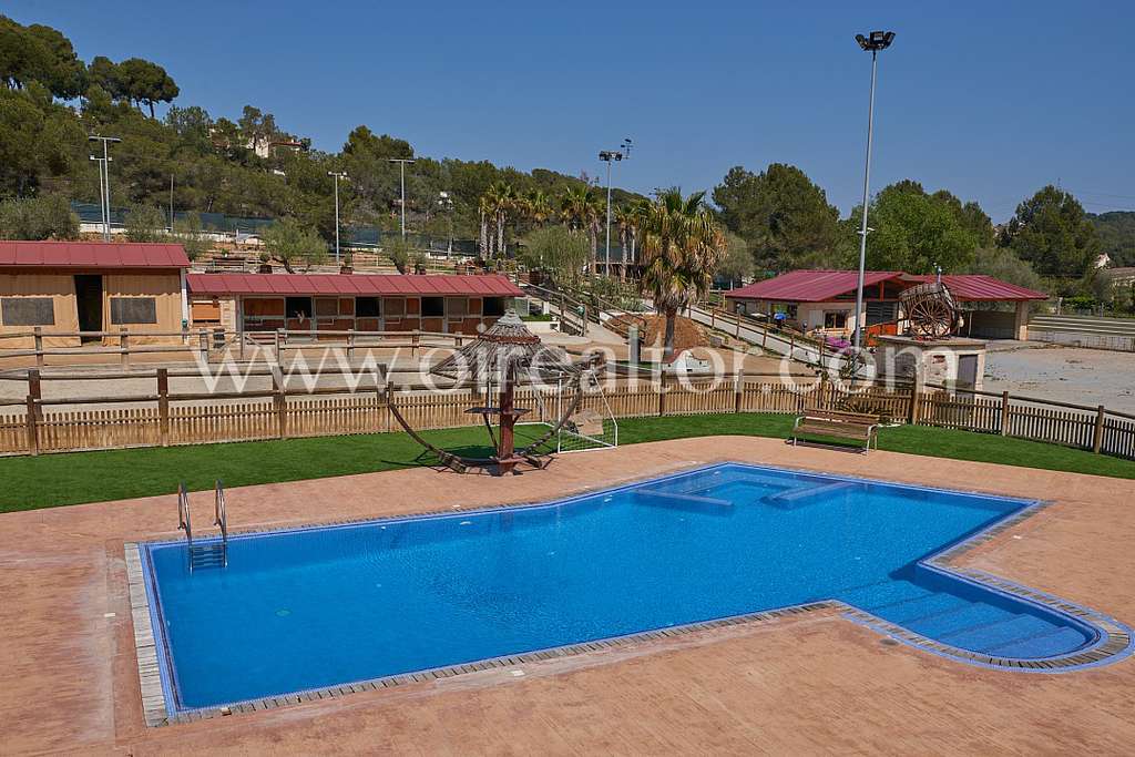 Este complejo contiene en su extensión un granero, una zona de taller, unos padocks, una pista de doma de 20 x 40 de sílice, picaderos, una piscina, cocheras con carruajes incluídos y dos viviendas de alto standing. Una de ellas – la principal y más grande – es una masía típica catalana totalmente reformada y convertida en una casa de dos plantas. En la primera encontramos una cocina de tipo americana con acabados modernos, una vitrocerámica en una gran y práctica isla central y un bonito horno de leña alojado en una de las esquinas. Se puede acceder al exterior a través de la cocina, mediante unos ventanales corredizos que llenan de luz todo este espacio.