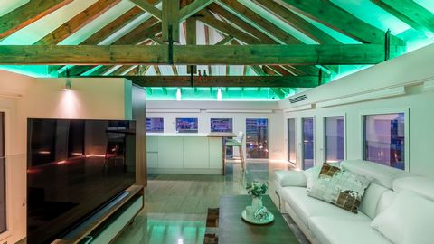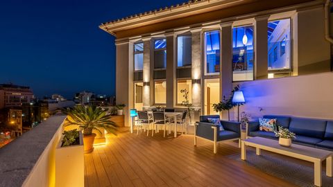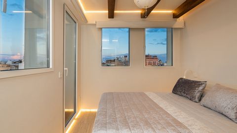 This unique duplex penthouse has undergone a complete reformation during 2021. Perched on top of one of the most emblematic buildings on Palma's Avenidas, it offers overwhelming views over the city and towards the sea. On the ground floor are two bedrooms, two bathrooms, guest w.c. and access to one of the two terraces. On the upper floor is the kitchen, living and dining area with wraparound windows with 360 degree views, wood beamed ceilings and direct access to the second terrace. With underfloor heating throughout, central A/C and domotic installation ensures the comfort and ease of managing the property view phone, ipad or computer. The property is being sold fully furnished and includes two garage parking spaces.