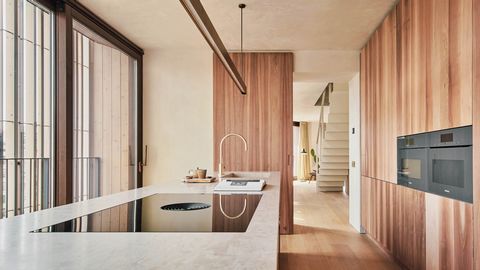 The apartment offers an open plan kitchen, dining and living room with floor to ceiling windows ensuring the maximum of natural light via perimiter balconies and sliding panels of wooden slats. The fully fitted kitchen with Miele appliances is blended with custom made furniture in natural wood and Binissalem natural stone. The blend of high ceilings rendered in artisan lime mortar, wooden flooring and walnut doors is truely exceptional. The day area is complemented with a guest bathroom. The night area offers a master suite with dressing area complemented with custom made wardrobes with cedar interiors and ensuite bathroom together with two additional bedrooms and a second bathroom. The property is complete with garage parking with includes electric charging points and accessed by car lift together with a storage room.