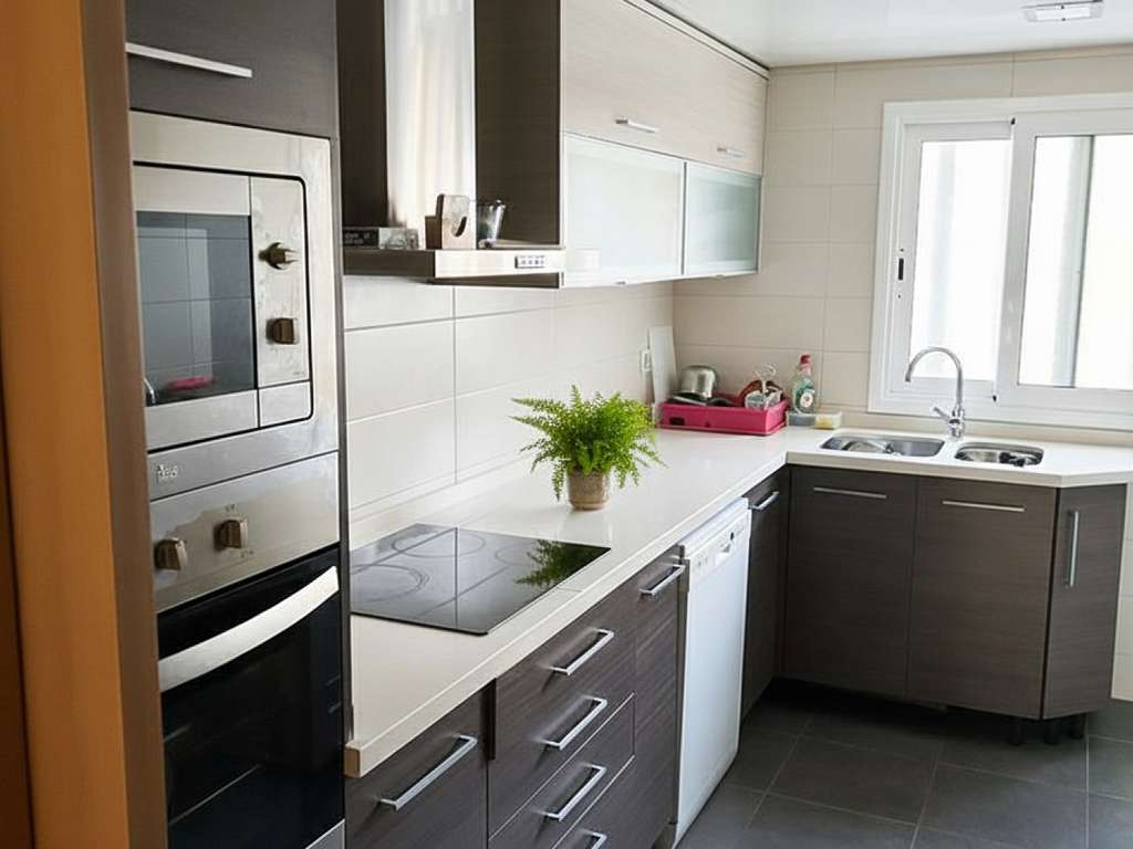Cocina equipada con vitrocerámica, zona de lavadero y calentador de agua.