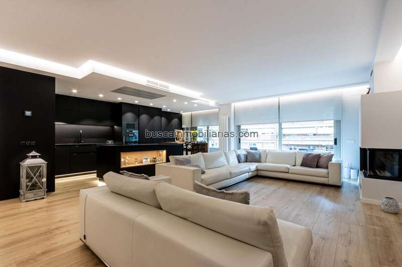 El corazón de la vivienda es su amplio salón-comedor de 70 m2, un espacio de líneas suaves y sofisticadas, presidido por una chimenea de diseño que aporta calidez y carácter. La cocina abierta Zania Premium, con mostrador de Teklam, es una pieza única que combina funcionalidad y estilo, aprovechando al máximo la luz natural. Desde el salón se accede directamente a la terraza principal, a través de grandes puertas correderas de cristal que crean una perfecta continuidad entre el interior y el exterior.