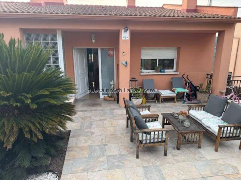 Terraza delantera con bonita terraza-estar y un cuidado jardín.