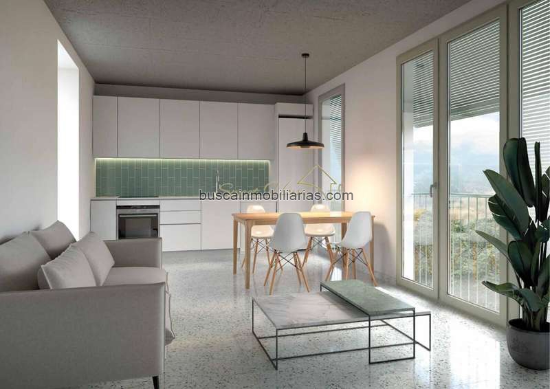 Hormigón visto en zonas comunes. Terrazo blanco-verde en viviendas y balcones.