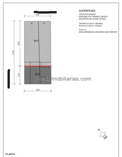A partir de los 15,50 metros y hasta el fondo de la parcela: edificabilidad para planta baja + 2 plantes piso