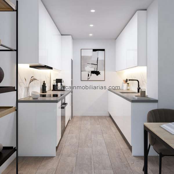 *Cocinas amuebladas con muebles altos y bajos de puertas blancos, segun piso, iluminación LED continuo bajo mueble. Encimera y frontal de armarios de cocina de laminado compacto con certificación PEFC, acabado color gris.