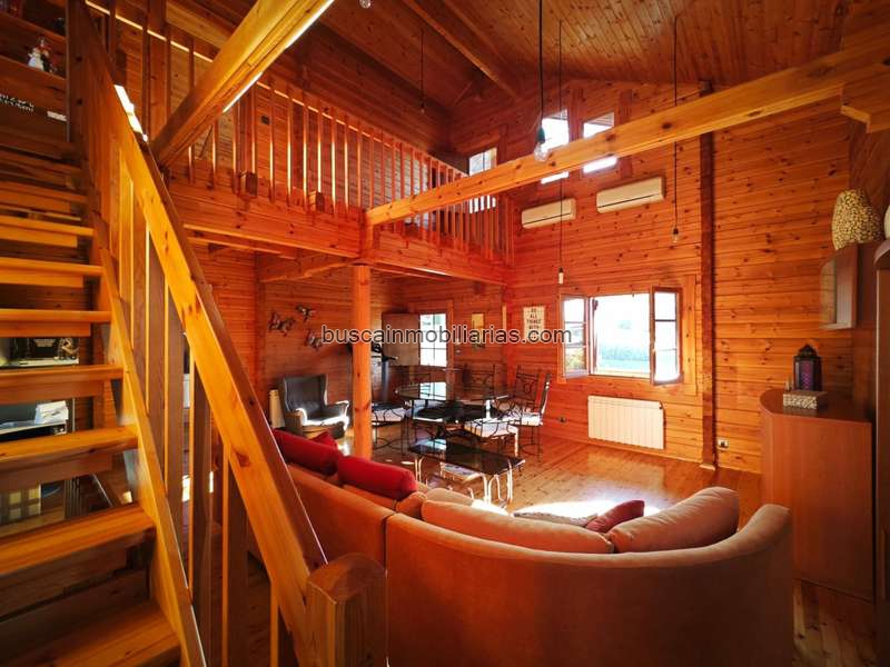 La vivienda dispone de un amplio salón-comedor con techos altos y vigas de madera vista, que aportan amplitud y personalidad al espacio. Grandes ventanales bañan la casa de luz natural y conectan el interior con el entorno verde que le rodea.
