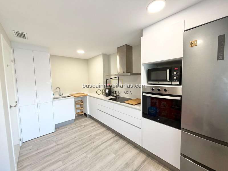 El salón comedor, de aproximadamente 25 m2, es un espacio luminoso y agradable, ideal para el día a día. La cocina office es exterior y está totalmente equipada, con muebles en blanco y encimera de inducción, ofreciendo un ambiente funcional y actual.
