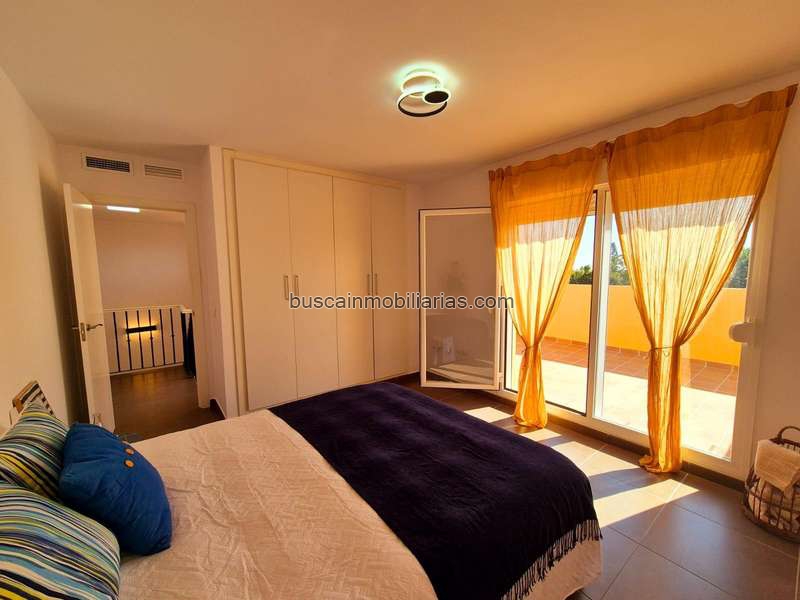 La vivienda cuenta con un salón luminoso, cocina equipada, aseo de cortesía, y un dormitorio principal en suite con vestidor y acceso directo a la terraza. En la planta superior se encuentran dos dormitorios y un baño completo.