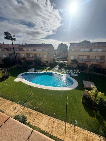 CONSTA DE HALL DE ENTRADA, COCINA INDEPENDIENTE CON LAVADERO, AMPLIO SALÓN CON SALIDA HACIA GRAN TERRAZA EXTERIOR CON VISTAS A LA PISCINA, PEQUEÑO PASILLO DISTRIBUIDOR HACIA CUARTO DE BAÑO COMPLETO Y DOS DORMITORIOS DOBLES CON ARMARIOS EMPOTRADOS, EL PRINCIPAL CON SALIDA TAMBIÉN A LA TERRAZA Y VISTAS ADEMÁS A LA PISCINA. LA VIVIENDA LLEVA ANEXA PLAZA DE APARCAMIENTO ASIGNADA DENTRO DE LA URBANIZACIÓN.