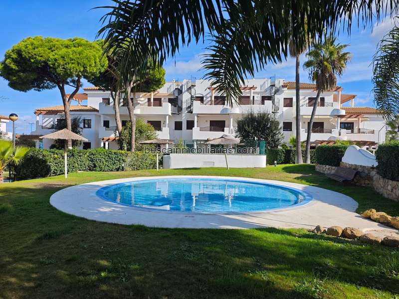 En el residencial Coto de Sancti Petri, situado a unos 800 metros de la conocida "Primera Pista" de la Playa de La Barrosa, tenemos este estupendo apartamento en planta baja, con jardín propio con salida directa a la piscina y las zonas comunes. El residencial cuenta con dos grandes piscinas de adultos y dos infantiles, pistas de padel y zonas de juego para los niños junto a una bonitas marquesinas de madera.