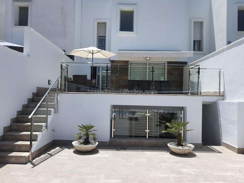 Adosado muy luminoso cercano a playa y a todo tipo de servicios, en un entorno tranquilo privilegiado donde poder disfrutar junto a la familia en cualquier época del año. La vivienda se encuentra construida sobre una parcela de 319 m2 con una superficie de 279 m2 distribuidos en: planta baja, compuesta de porche de entrada, hall con patio inglés para dar mayor luminosidad a la vivienda, dormitorio, cuarto de baño, cocina totalmente equipada, salón comedor, ambos con salida a una amplia terraza con acceso a las zonas verdes y de piscina, escalera de acceso a la planta primera y planta sótano; planta primera, se distribuye en pasillo, dos dormitorios con acceso a terrazas, cuarto de baño y escalera de acceso a la terraza solárium con espectaculares vistas a la bahía. La planta inferior de la vivienda consta de un sótano diáfano adaptable a vivienda, zona de juegos de niños, gimnasio, zona de estar, etc.. con escalera exterior desde donde acceder a las zonas verdes y de piscina. Plaza de aparcamiento cubierta, puerta automática de coches, placas solares, preinstalación de aire acondicionado y calefacción. Totalmente amueblada para entrar a vivir.