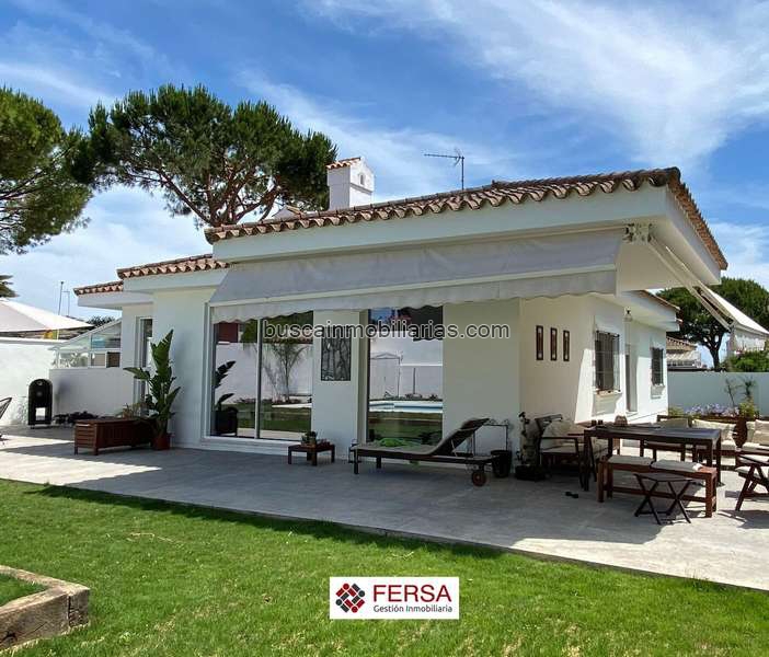 FERSA INMOBILIARIA les ofrece este estupendo chalet en venta, ubicado en una de las mejores zonas del Puerto de Santa María. Reformado íntegramente en 2021 Cuenta con gran salón con salida y vistas al porche y a la piscina, amplia cocina completamente equipada, cuatros dormitorios, tres de ellos con baños en suite. Uno de los baños tiene doble entrada, haciendo también de cortesía.