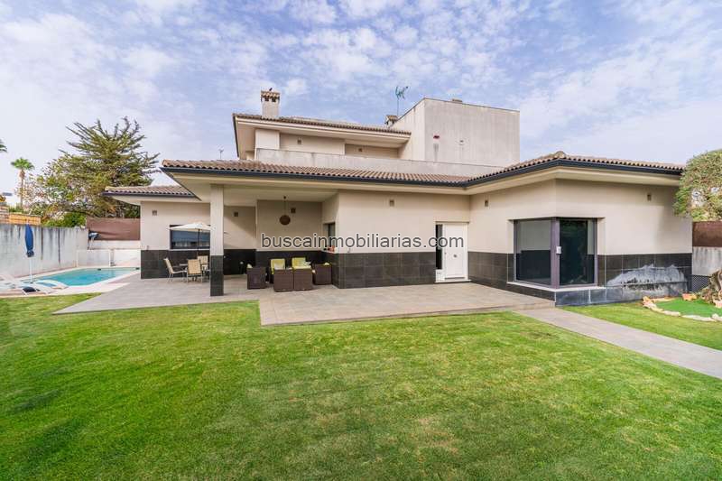 Magnífica casa situada en una de las zonas más valoradas de Jerez de la Frontera. Dispone de muy buenas comunicaciones que la conecta con todo fácilmente. La parcela, con 600 m2., se dispone en forma casi cuadrada con amplia fachada a una avenida de gran amplitud. En ella se sitúa una piscina con un tamaño perfecto (3,7 x 9 m.) para refrescarse y relajarse en los calurosos días estivales. El espacio restante de la parcela es ideal para barbacoas con familia o amigos o simplemente para sentarse a leer y disfrutar del tiempo libre. Es una casa concebida de forma práctica, para economizar el mantenimiento de la misma en su exterior. Su estilo destaca por su atemporalidad con un toque tradicional, con tejados inclinados, pero de tejas negras y fachadas con líneas rectas que le dan una imagen de modernidad. Como toda casa que se haya vivido, ésta ha sido el hogar de una familia que ha visto crecer a sus hijos y que ahora deciden comenzar una nueva etapa como lo puede ser la de usted y la de los suyos. Destaca su amplitud, con 536 m2. repartidos en planta sótano más dos plantas que se distribuyen de la siguiente forma: PLANTA SÓTANO: A él se accede tanto internamente por la vivienda como por el exterior con los vehículos a través de su rampa de acceso. Son 4 los coches que puede guardar y aún queda espacio para una sala de instalaciones/trastero y otra, muy espaciosa, perfectamente equipada y decorada para el ocio con zona de estar, baño y cocina abierta; PLANTA BAJA/PRINCIPAL: Un hall nos recibe dejándonos entrever las generosas dimensiones que nos vamos a encontrar en el resto de la casa. La cocina, en forma de L, está totalmente equipada con altas calidades y tiene una zona de office con mesa comedor. El salón cuenta con amplios ventanales y chimenea. El resto de la planta se distribuye en 3 dormitorios con sus 3 baños incorporados más un aseo. PLANTA ALTA/PRIMERA: Para los más independientes de la casa, aquí nos encontramos un dormitorio, baño y sala de estar con acceso a una bonita terraza. En definitiva, es una casa que lo tiene todo: diseño, calidades, amplitud, luminosidad, espacios exteriores,... y muy cómoda, al disponer de las habitaciones principales en una sola planta. Si le ha convencido, contáctenos y concierte una visita!