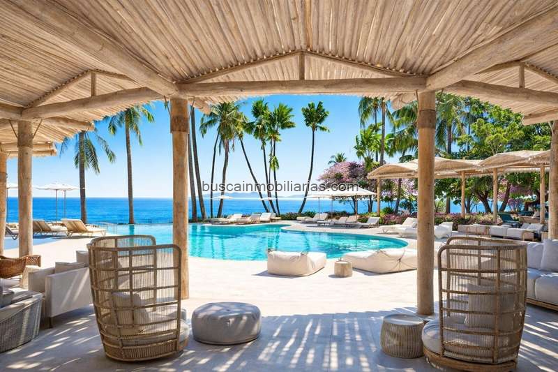 Piscina infinita icónica con solárium y bar junto a la piscina