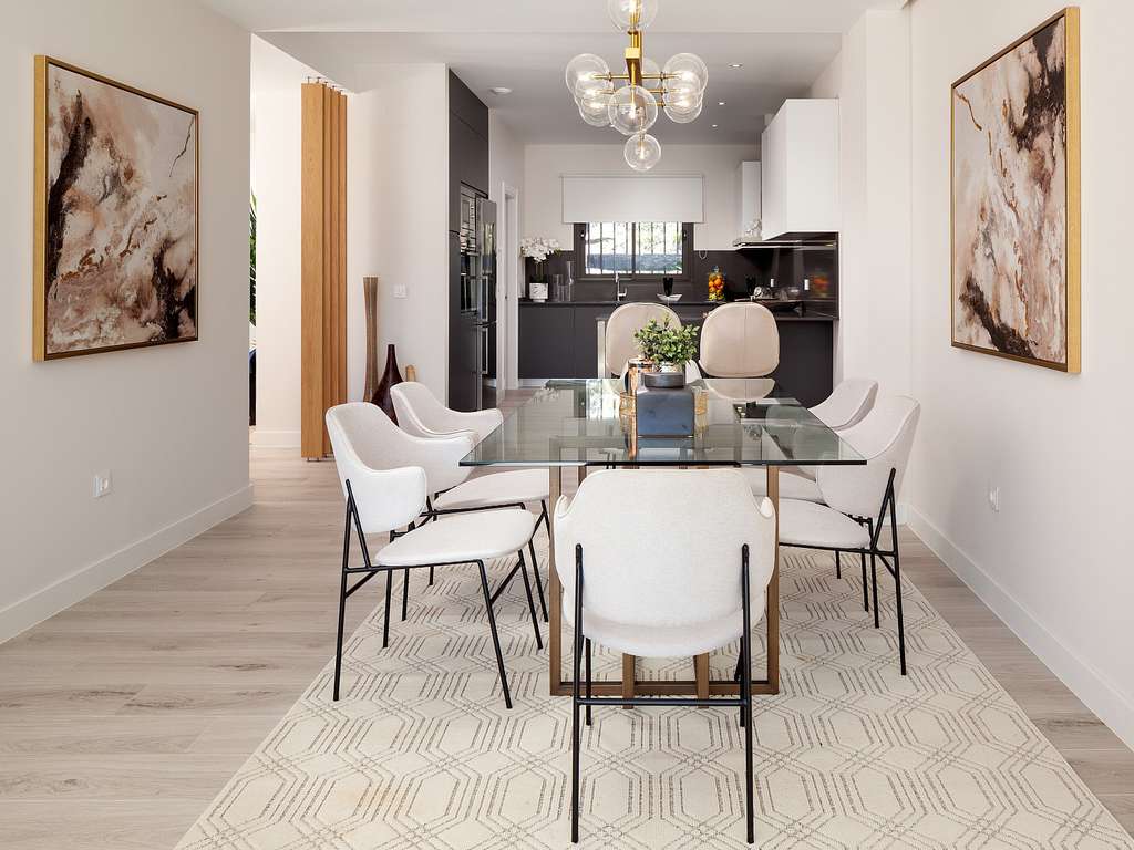 Vivienda exclusiva, al acceder a la planta baja nos recibe un espectacular salón - comedor con la cocina integrada. La luz que inunda toda la estancia procede de grandes ventanales que dan acceso al porche y al jardín.