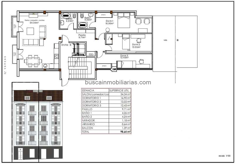 1. Salón con cocina americana (sin mobiliario) orientado a Calle Vargas ó 2. Salón y 1 dormitorio orientado a Calle Vargas y cocina independiente (sin mobiliario) a patio.